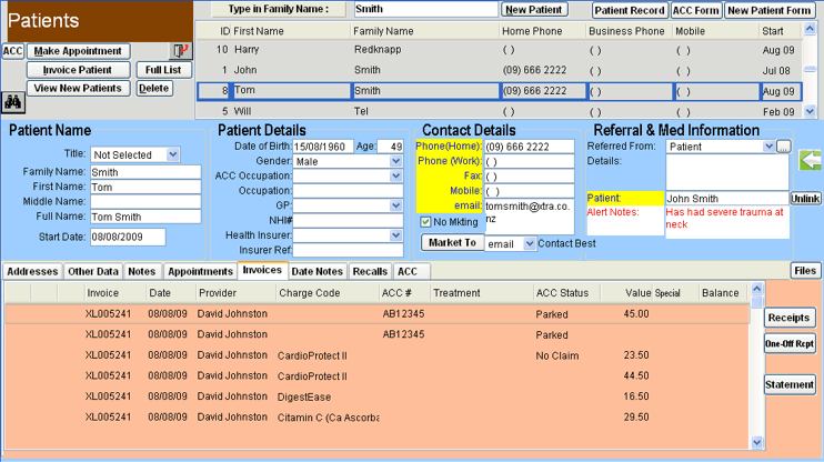 A full PMS (Practice Management System) designed in New Zealand for Chiropractors, Osteopaths, Acupuncturists, Physiotherapists and others in the Allied Health Sector. Facilities available within this package include Patient Details, Multiple Providers, Visit Codes, Electronic ACC, Visit Notes, Appointments, sending Newsletters, emailing and/or Texting Reminders. The aim is to assist you in managing your practice with a minimum of effort and stress, and to permit expansion through smart marketing.