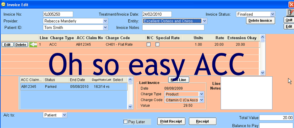 Cut down on your outstanding debtors - patients and ACC both, while saving on paper, postage and time. Check out 'Oh so easy ACC' above to see just how easy preparing and sending claims to ACC can be!